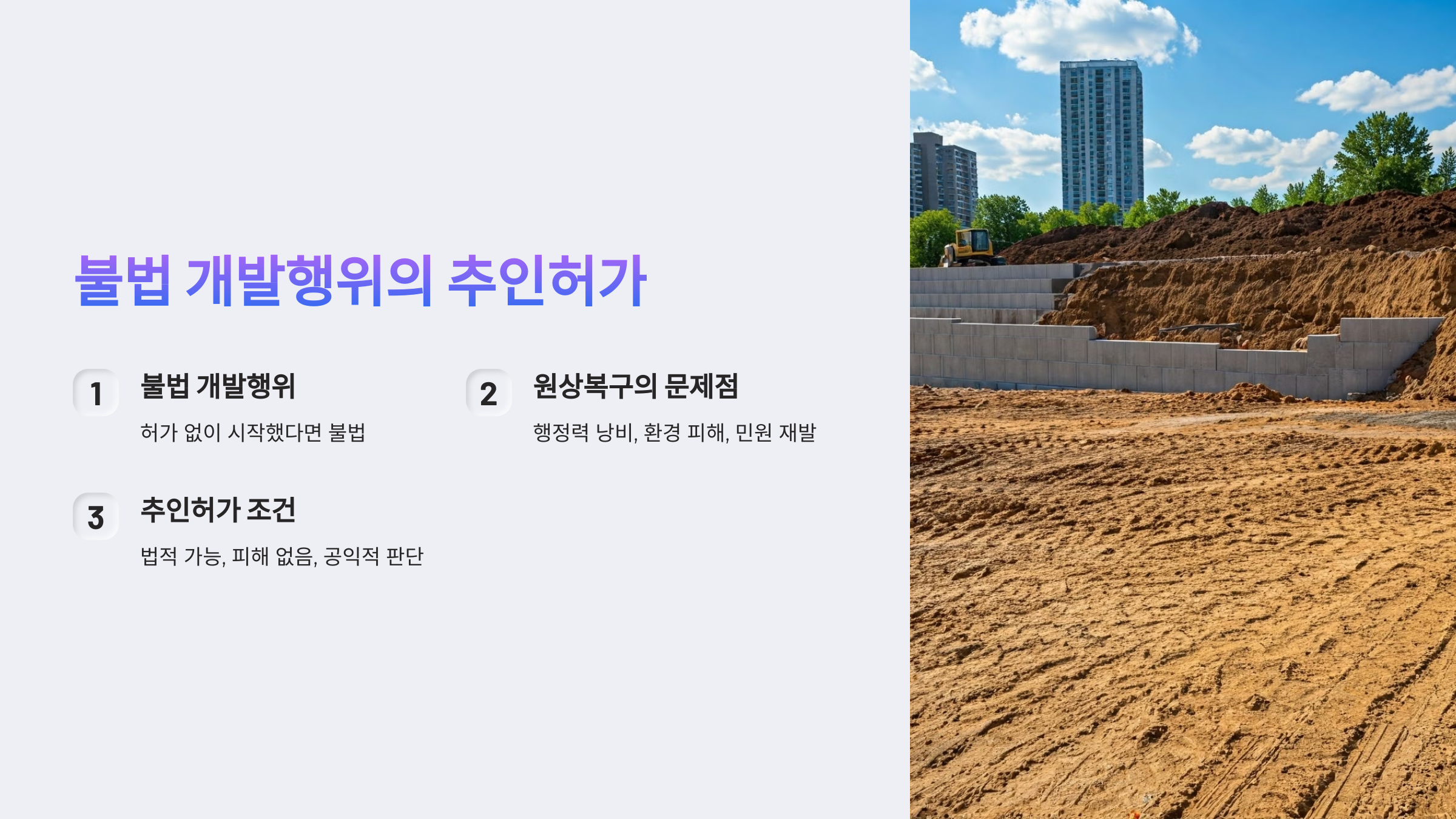 ❗ “허가 없이 먼저 공사했어요… 무조건 철거해야 하나요?”개발현장에서 꽤 흔한 상황이에요.허가 받기 전 조급하게 공사를 시작했다가,현장점검에서 ‘불법 개발행위’로 적발되는 경우 말이죠.이럴 땐 보통⛔ 공사중지 + 원상복구 명령이 내려집니다.근데 말이죠…무조건 철거하는 게 ‘최선’일까요?🧱 철거보다 더 큰 피해? 원상복구의 아이러니예를 들어볼게요.이미 성토 완료옹벽 시공 끝주변 민원 없음향후에도 동일 조건이면 허가 문제 無그럼에도 불구하고 "다시 원상복구하라"고요?그 과정에서💨 비산먼지 발생💸 행정력 낭비📉 주민 불편이게 과연 효율적일까요?그래서 생긴 개념이 바로 **“추인허가”**입니다.📜 국토계획법엔 없지만, 실무에선 ‘OK’ 가능성 있어요법령에는 ‘추인허가’라는 말, 명시돼 있지 않아요.그..